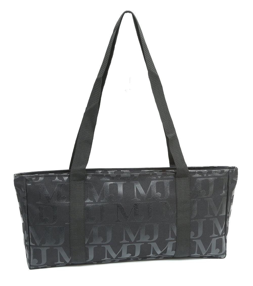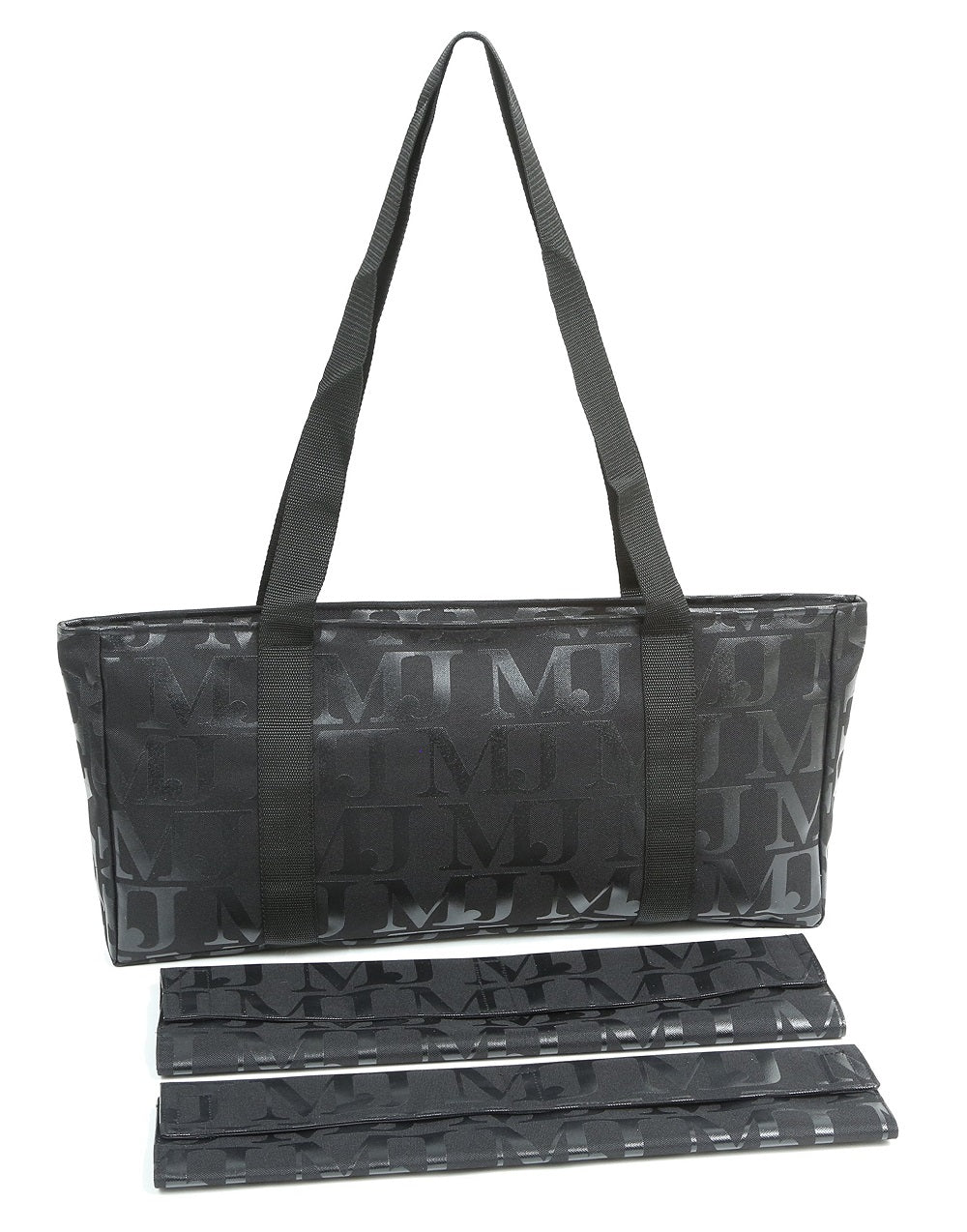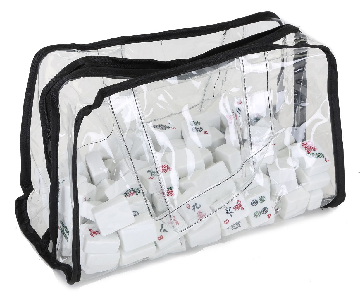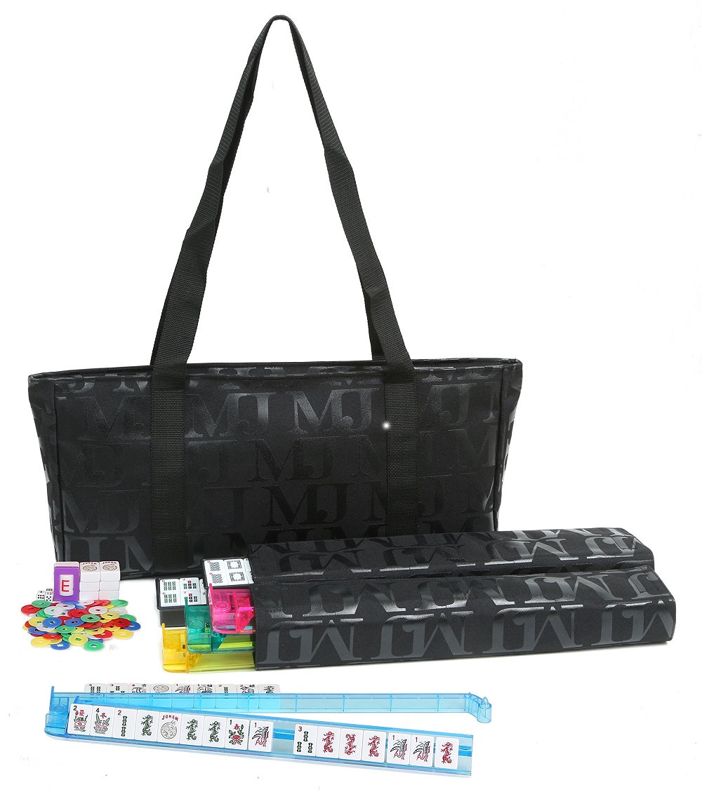 Black with Black Mah Jongg Set Soft Carrying Case with shoulder straps, 2 matching Velcro sleeve wraps for racks and tile trays plus a vinyl tile storage case. Case has a zippered closure and measures approximately 21" X 10" with large gusset for carrying full Mah Jongg set with racks. Contents: 1 Mah Jongg Soft Carry Case, 2 Matching Wrap Sleeves, 1 wrap for your tile trays and 1 Wrap for your racks. Bonus includes 1 Vinyl Tile Storage Case. DOES NOT INCLUDE MAH JONG SET OR RACKS.Black with Black MJ Designer