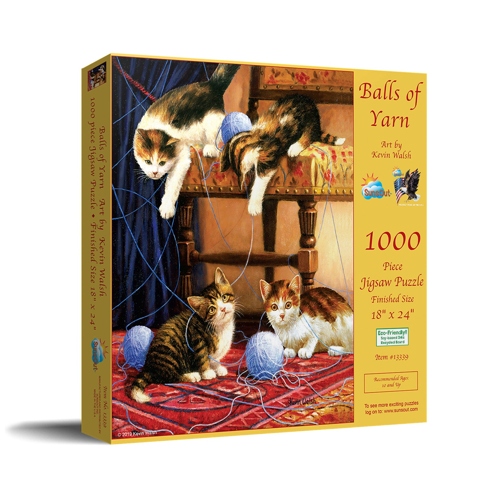 Immerse yourself in the captivating allure of the Balls of Yarn 500 pc Jigsaw Puzzle by SunsOut Puzzles, a delightful concoction of artistic tranquility designed by renowned artist Kevin Walsh. This heartwarming scene filled with playful kittens and colorful yarn, measuring 18" x 24" upon completion, transports you straight into a whimsical world, promising a charming puzzle journey that is both engaging and soothing. This quality craft by SunsOut, crafted from high-quality recycled cardboard, is not just a regular pastime, it's a testament to fine craftsmanship featuring precisely interlocking pieces ensuring a snug fit. Any issues with missing or damaged pieces are swiftly resolved, illustrating SunsOut's firm commitment to customer satisfaction. SunsOut's commitment to environmental preservation is evident in their use of eco-friendly soy-based inks and top-quality recycled materials in the making of these USA-made puzzles. Not just a journey into art, this puzzle makes for a thoughtful gift for any puzzle enthusiast. With its beautifully licensed artwork offering hours of thoughtful entertainment, it's a prestigious addition to any puzzle collection, bringing delight to both novices and experienced solvers. As a woman-owned small business, SunsOut takes pride in offering products inspire creativity and passion. Discover the joy of piecing together a masterpiece with the Balls of Yarn 500 pc Jigsaw Puzzle – and let each piece unravel tranquility and inspiration into your life.