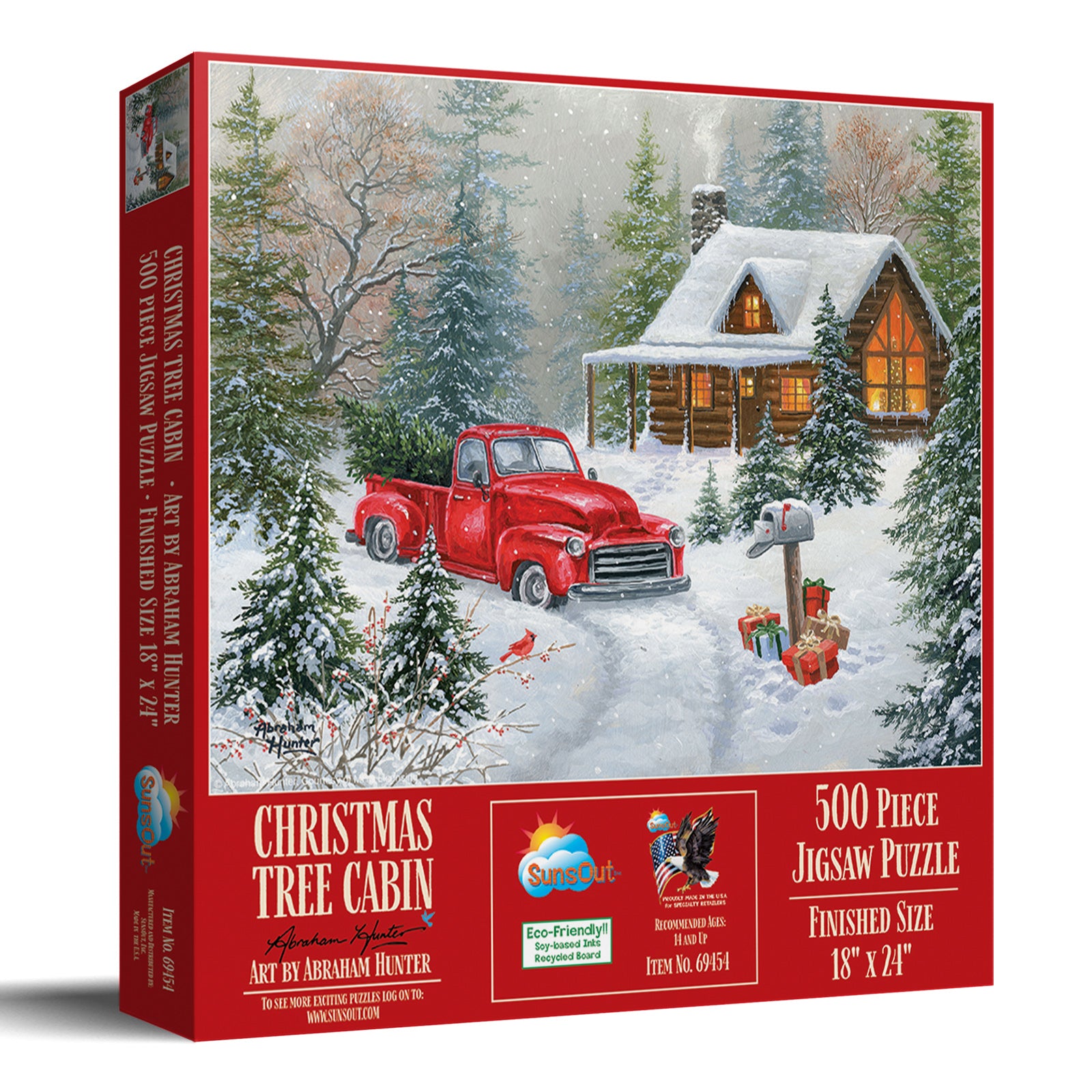 Christmas Tree Cabin 500 pc Jigsaw Puzzle by SunsOut- 500 Piece Jigsaw Puzzle - Completed Size: 18" x 24" - Puzzle Artist: Abraham Hunter - SunsOut Puzzles are Proudly Made in the USA - Interlocking Pieces and Durable Construction: SunsOut jigsaw puzzles feature interlocking pieces that fit securely, making assembly easier and reducing frustration. Made with high-quality recycled cardboard, they are durable and to easy to work with - Warranty: SunsOut puzzles being made in the USA ensures high manufacturing standards include a worry-free guarantee ensuring any issues with missing or damaged pieces are resolved, reflecting SunsOut's commitment to quality and customer service. - Eco-Friendly Materials: SunsOut puzzles are crafted with eco-friendly materials