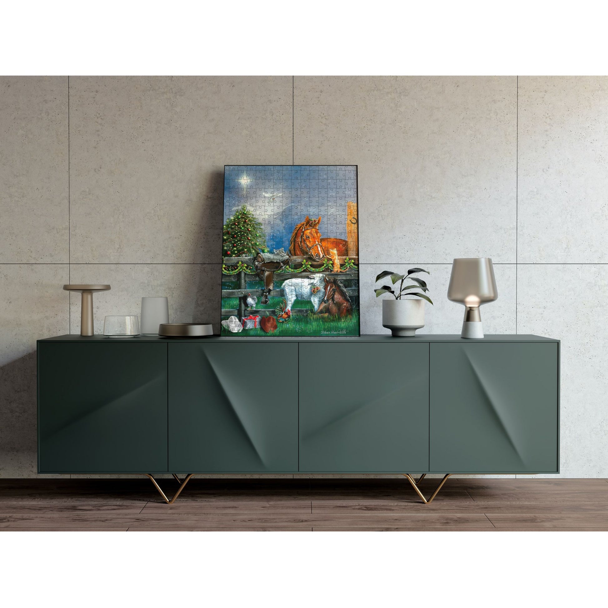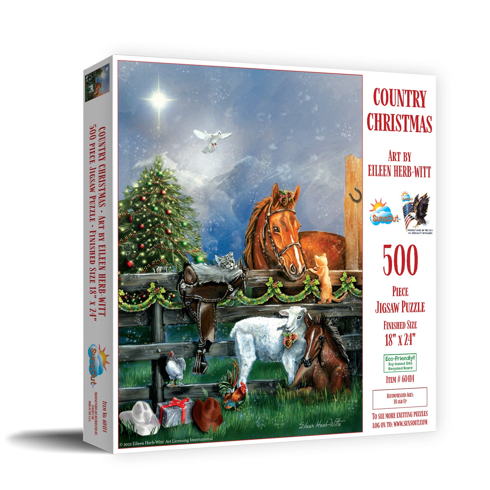 Experience the tranquility and charm of the countryside during the holiday season with the Country Christmas 500 Piece Jigsaw Puzzle by SunsOut Puzzles. This lovely piece measures 18" x 24" when completed, showcasing the serene beauty of a snowy Christmas scene crafted by the masterful artistry of Eileen Herb-Witte. Each intricate detail captures her passion for nature and holiday magic, the fully licensed artwork providing an authentic and immersive puzzle-building experience. Furthermore, the puzzle is crafted from high-quality recycled cardboard with precisely cut, interlocking pieces for easy assembly, faithfully reflecting SunsOut's commitment to eco-friendly production through the use of soy-based inks and sustainable materials. SunsOut Puzzles is also proudly woman-owned and made in the USA, boasting superior craftsmanship and a worry-free guarantee to resolve any issues with missing or broken pieces. The Country Christmas 500 Piece Jigsaw Puzzle makes a perfect gift for puzzle enthusiasts, packaged in a large, full-color display box that will become a fantastic addition to your holiday traditions.