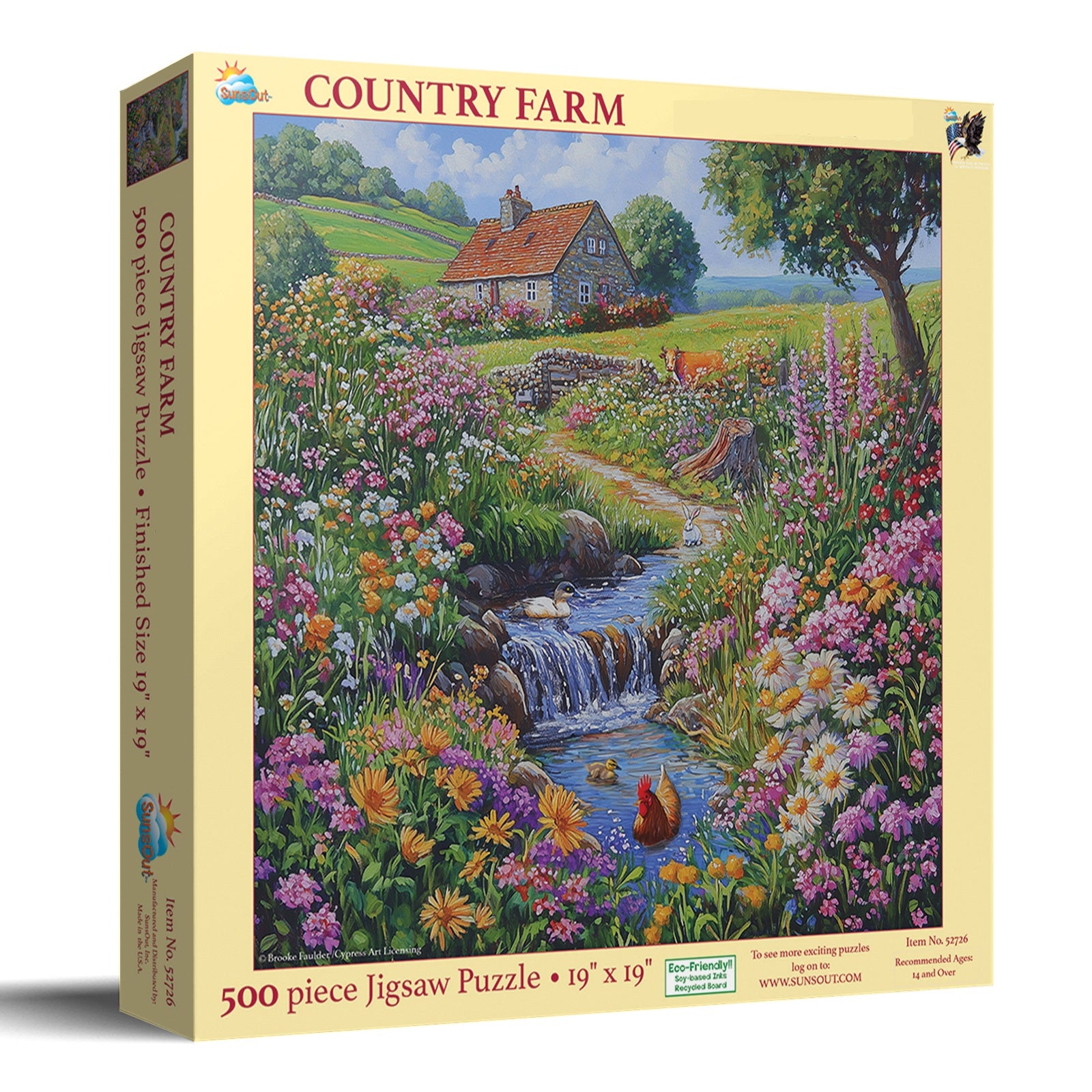 Country Farm 500 Piece Jigsaw Puzzle - 500 pc Jigsaw Puzzle - Completed Size: 19" x 19" - Puzzle Artist: Tom Crehan - Interlocking Pieces and Durable Construction: SunsOut jigsaw puzzles feature interlocking pieces that fit securely, making assembly easier and reducing frustration. Made with high-quality recycled cardboard, they are durable and to easy to work with - Warranty: SunsOut puzzles being made in the USA ensures high manufacturing standards include a worry-free guarantee ensuring any issues with missing or damaged pieces are resolved, reflecting SunsOut's commitment to quality and customer service. - Eco-Friendly Materials: SunsOut puzzles are crafted with eco-friendly materials