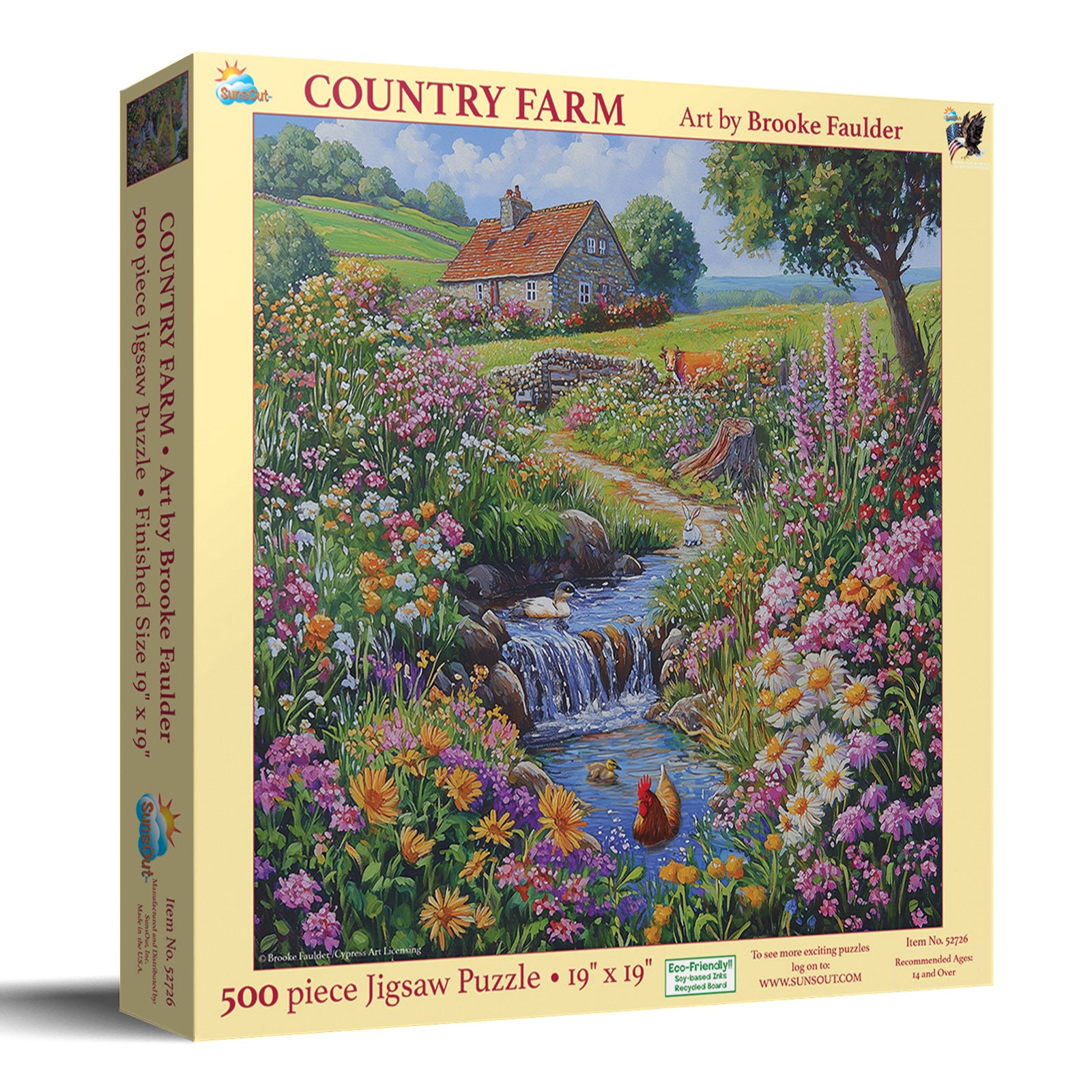 Country Farm 500 Piece Jigsaw Puzzle - 500 pc Jigsaw Puzzle - Completed Size: 19" x 19" - Puzzle Artist: Brooke Faulder - Interlocking Pieces and Durable Construction: SunsOut jigsaw puzzles feature interlocking pieces that fit securely, making assembly easier and reducing frustration. Made with high-quality recycled cardboard, they are durable and to easy to work with - Warranty: SunsOut puzzles being made in the USA ensures high manufacturing standards include a worry-free guarantee ensuring any issues with missing or damaged pieces are resolved, reflecting SunsOut's commitment to quality and customer service. - Eco-Friendly Materials: SunsOut puzzles are crafted with eco-friendly materials