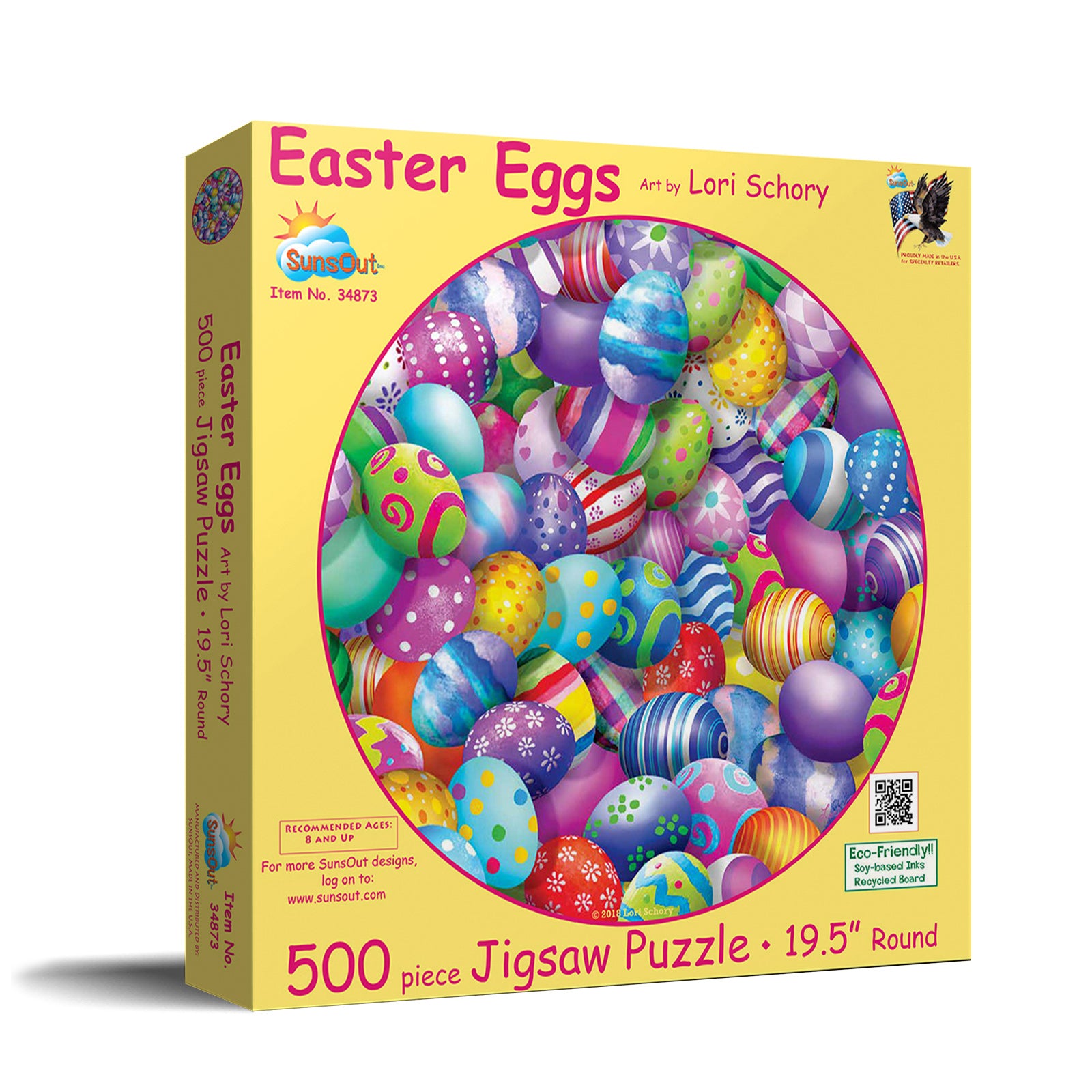 Immerse yourself in Easter festivities with the vibrant SunsOut Easter Eggs 500 Piece Jigsaw Puzzle. Intricately decorated by Lori Schory, this 19.5" diameter centerpiece offers a satisfying and challenging experience with durable, interlocking pieces. Crafted from high-quality recycled cardboard, we guarantee prompt replacement of missing or damaged pieces, reflecting our exceptional customer service. SunsOut puzzles, proudly made in the USA, respect our eco-conscious ethos with soy-based inks and recycled board contributing to sustainability and supporting the local economy. As a woman-owned small business, we passionately blend environmental responsibility with superior entertainment. This thoughtfully crafted jigsaw puzzle, while promoting mental relaxation and shared joy, makes an ideal present for adults. Indulge in a worry-free entertaining pastime that transforms quiet moments into cherished memories with our captivating Easter-themed brilliance.