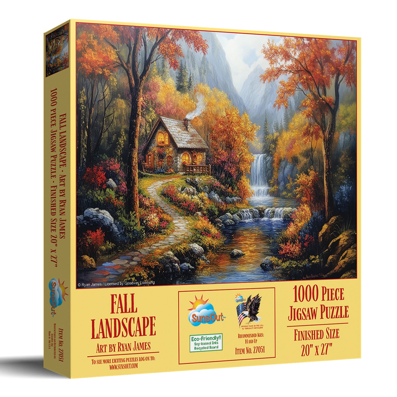 Immerse yourself in the breathtaking beauty of autumn with the Fall Landscape 1000 Piece Jigsaw Puzzle by SunsOut, which perfectly captures the essence of a peaceful countryside getaway through the stunning artwork of renowned artist Richard Courtney. With finished dimensions of 18" x 24", this puzzle invites you to feel the crisp air and vibrant colors of fall right from your living room, offering a journey into serene tranquility. Experience seamless assembly with expertly designed interlocking pieces crafted from high-quality recycled cardboard, ensuring a reliable and pleasurable puzzling experience without the frustration of loose pieces. Committed to sustainability, SunsOut uses eco-friendly soy-based inks and premium recycled materials, making your enjoyment kind to the planet. Each randomly shaped die-cut piece adds a layer of fun and challenge to your adventure while being mindful of the environment. Proudly made in the USA, each puzzle reflects a dedication to superior quality and customer satisfaction, complete with a worry-free guarantee that promises prompt resolution for any issues with missing or damaged pieces. This puzzle not only showcases the beauty of nature, with its rustic cabin and flowing waterfall, but also encapsulates the spirit of Americana, invoking feelings of nostalgia and warmth. Transform your puzzle collection with this exquisite piece from a woman-owned small business, whether you're a seasoned enthusiast or a casual solver, as the Fall Landscape 1000 Piece Jigsaw Puzzle promises both challenge and reward, making it an exceptional gift or a personal treat to enjoy for years to come.