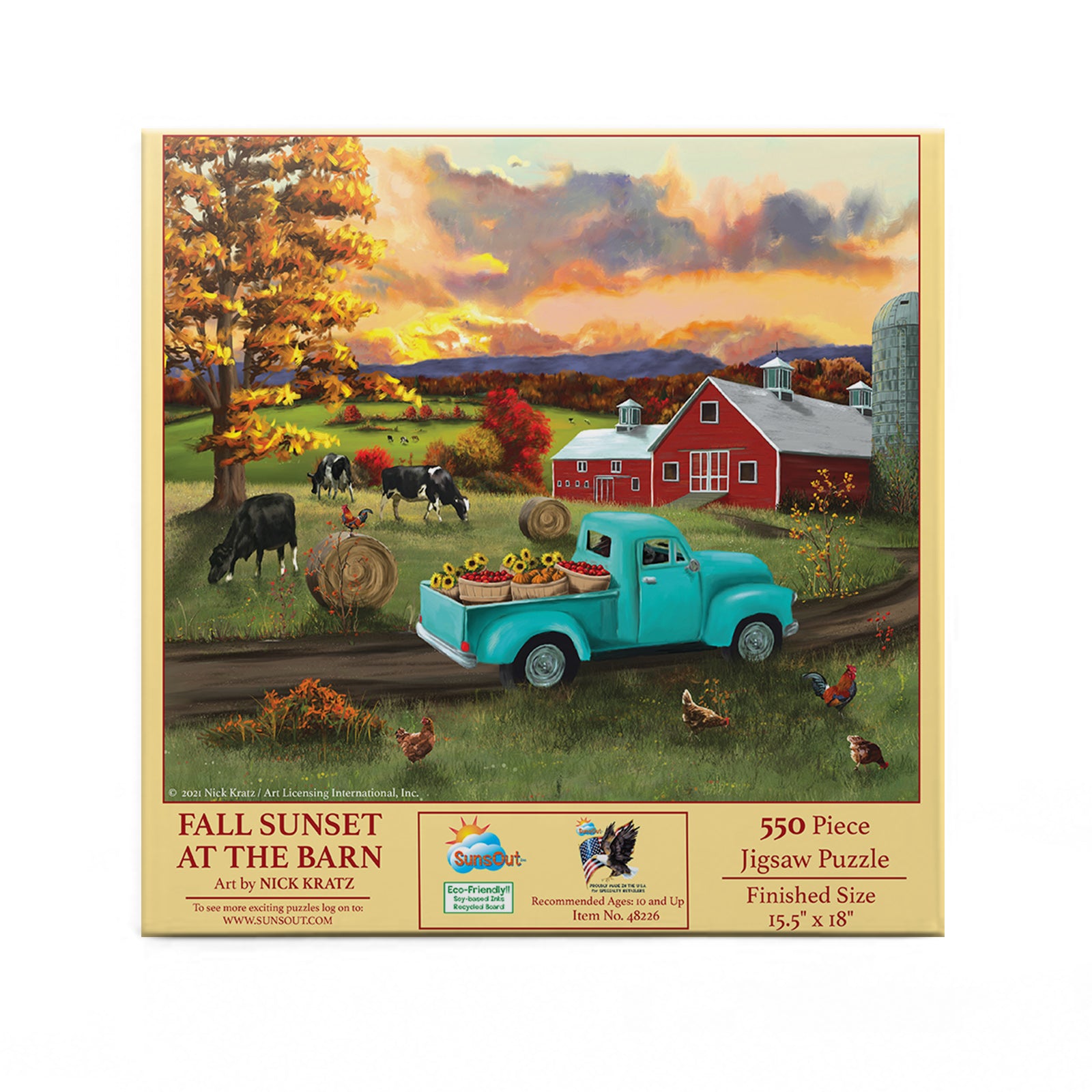 The Fall Sunset at the Barn 500 Piece Jigsaw Puzzle by SunsOut Puzzles invites you to immerse yourself in the rich hues of autumn. This masterpiece by Nick Kratz displays a peaceful farm scene, representing tranquility painted by the vibrant colors of nature. Measuring 15.5" x 18" when assembled, this puzzle creates a picturesque escape into the countryside from your living room. SunsOut is renowned for its high-quality craftsmanship, seen in the snugly interlocking pieces that render assembly easy and completion satisfying. They use durable, high-grade recycled cardboard for an enjoyable experience perfect for all puzzle enthusiasts. Proudly made in the USA, SunsOut products endorse local craftsmanship and meet the highest manufacturing standards. The use of soy-based inks and premium recycled board makes this puzzle environmentally friendly. With fully licensed artwork from talented artists like Kratz, each piece captures nature’s vibrancy with impressive precision. Its themes of farms, animals, and landscapes make it the perfect hobby for adults and nature lovers seeking relaxation. This puzzle not only doubles as a thoughtful gift for any occasion, allowing you to share the serene and creative experiences it offers with others but also supports a worry-free purchase through SunsOut's excellent customer service and a comprehensive warranty.