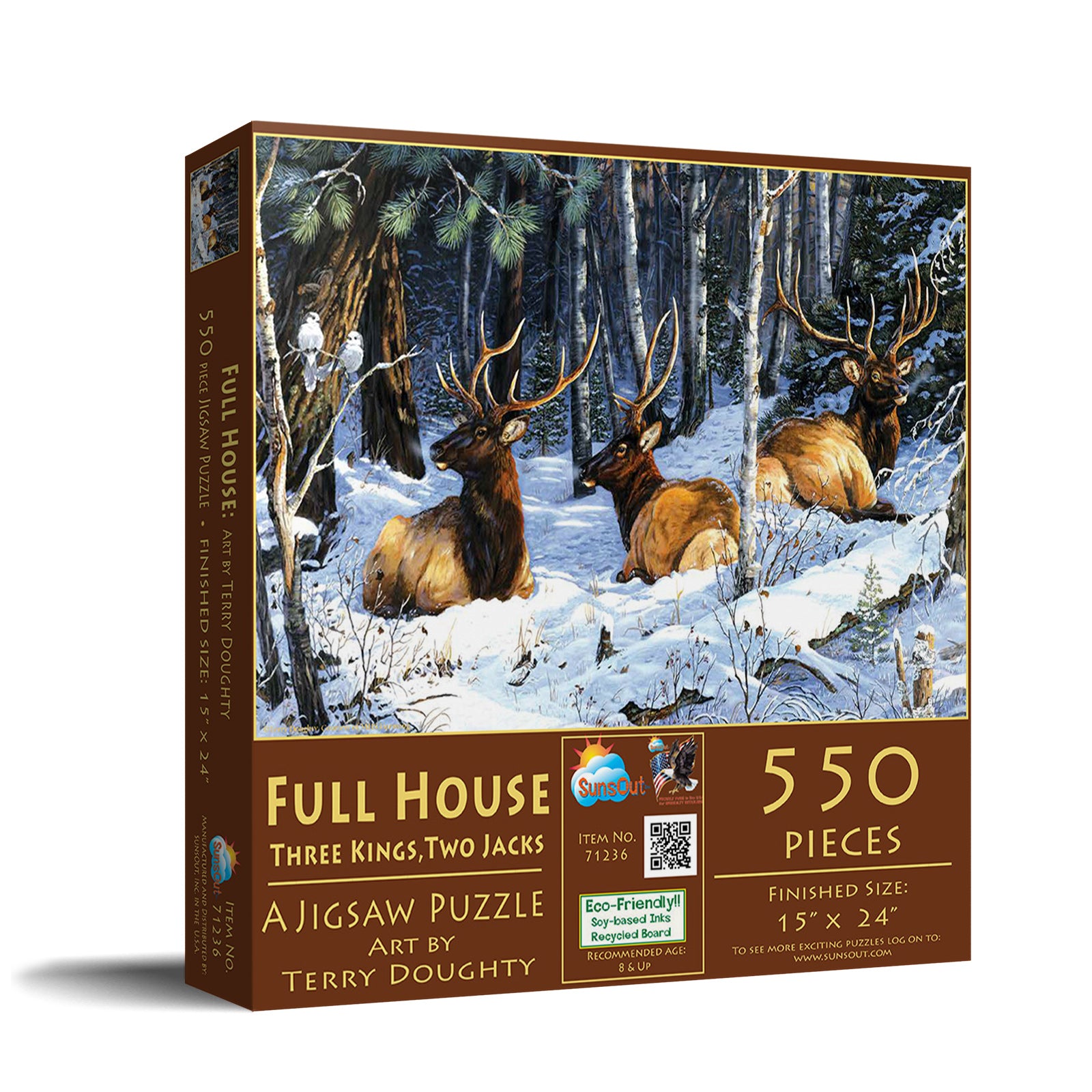 The Full House Three Kings Two Jacks 550 Piece Jigsaw Puzzle is an enchanting masterpiece by Terry Doughty that lets you delve deep into the heart of winter wildlife. Completing the 15" x 24" jigsaw puzzle transports you on a tranquil journey into nature's peaceful beauty through SunsOut's impeccably crafted interlocking design. Proudly made in the USA, these puzzles ensure a secure fit and are crafted from high-quality, eco-friendly recycled cardboard bedecked with soy-based inks. The resilient pieces remain as enduring as your joy in assembling this puzzle. Believed to be more than just a puzzle, it constitutes a delightful gift that promises countless hours of creativity in the course of contributing to a sustainable future. In addition to their aesthetically pleasing puzzles and their steadfast commitment to the environment, SunsOut—a woman-owned small business—celebrates art and empowerment, operating with fully licensed artworks from renowned artists like Terry Doughty and fostering a sense of diversity and community. Each puzzle purchase, therefore, becomes a support for creativity, bringing with it a deeper sense of purpose. With Full House Three Kings Two Jacks, every puzzle piece combined represents a piece of nature's beauty, the pride of quality craftsmanship, and sustained love for the environment.
