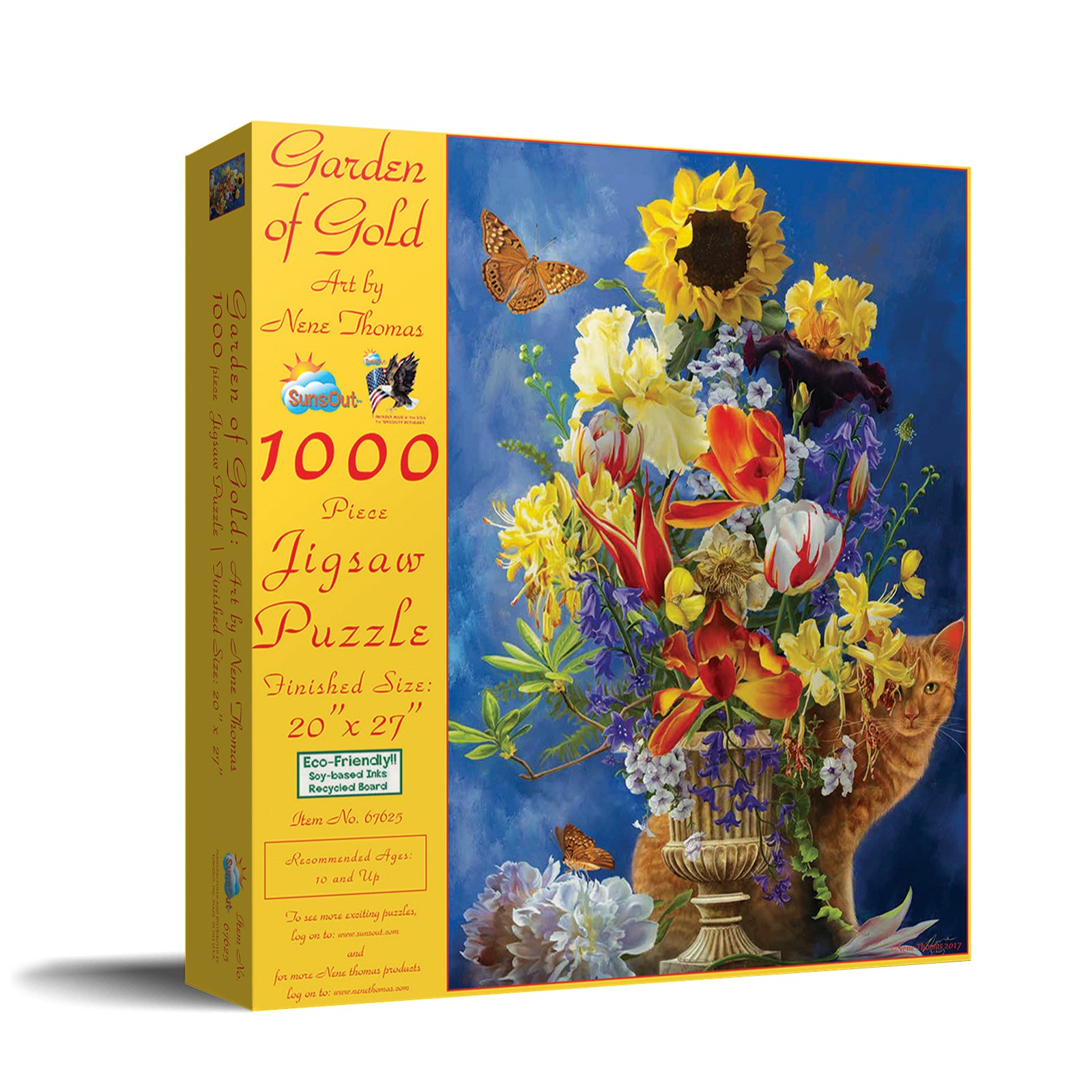 Unveil and piece together nature's splendor with Garden of Gold 1000 piece jigsaw puzzle, an artistic masterpiece by renowned artist Nene Thomas. Indulge in vibrant color palettes and intricate details that engage your imagination and soothe your soul. Crafted with pride and precision by SunsOut Puzzles, the eco-conscious brand uses high-quality recycled cardboard and soy-based inks for creating durable, easy-to-handle pieces that interlock seamlessly. Boasting a rich legacy of American craftsmanship, SunsOut puzzles are made in the USA, offering assurance of quality and the prompt resolution of any issues with missing or damaged pieces. Empower diversity and support a woman-owned small business by investing in this high-quality puzzle. Measuring 20" x 27", the Garden of Gold puzzle offers captivating challenges for adults and endless hours of rewarding fun, helping you reconnect with your artistic side and reduce stress. Enjoy the mesmerizing journey into this golden garden and create a stunning piece of art that emphasizes both fun and responsibility.