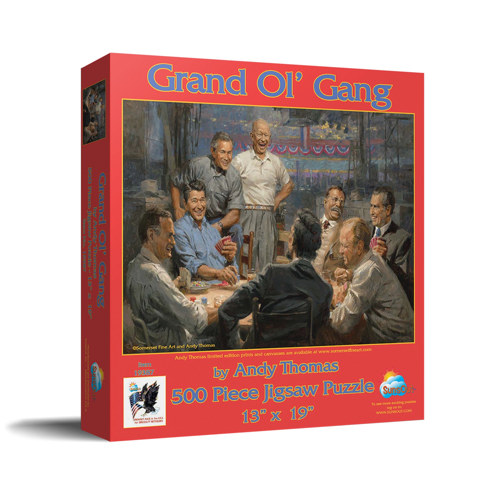 Immerse yourself in a moment of Americana with the enchanting "Grand Ol' Gang" 500 piece jigsaw puzzle for adults, crafted with the vibrant storytelling artistry of Andy Thomas. Measuring 13" x 19" upon completion, the puzzle showcases superior craftsmanship and is made with high-quality recycled cardboard for durability, all from the proudly woman-owned SunsOut. The company, based in the USA, stands by a worry-free guarantee, reflecting their firm commitment to exceptional quality and customer service. This eco-friendly puzzle is created with soy-based inks and premium recycled-board, demonstrating a joint commitment to supporting both the environment and the creative community with licensed artwork from top-notch artists like Andy Thomas. Packaged in a large full-color display box, it provides an elegant presentation and excellent protection until you're ready to dive into the assembly process. By choosing SunsOut puzzles, you're not only indulging in a fun leisure activity but also supporting the empowerment of women in business. Overall, assembling this captivating puzzle will provide a rewarding journey, crafting a colorful snapshot of American history whether for a quiet afternoon or a shared endeavour with loved ones.