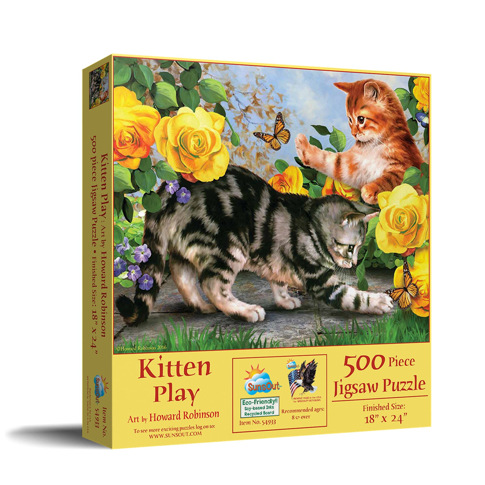 Dive into a world of whimsy and charm with the enchanting Kitten Play 500 Piece Jigsaw Puzzle by SunsOut. Renowned artist Howard Robinson has created a vibrant garden setting that captures the playful spirit of kittens. As you assemble the interlocking pieces, crafted from high-quality recycled cardboard, you'll revel in the delightful details that bring the artwork to life. You're assured of a snug fit, and the durable design ensures a satisfying experience as you watch your 18" x 24" masterpiece unfold. Made with pride in the USA, SunsOut reflects commitment to superior quality and customer satisfaction. Each Kitten Play puzzle comes with a worry-free guarantee and supports a woman-owned small business. Keeping sustainability in mind, they use soy-based inks and recycled board materials, emphasizing their eco-friendly approach while also helping to protect the planet. This 500 piece jigsaw puzzle for adults is a perfect gift for friends and family, promising hours of enjoyment and mental stimulation. Unwind on a quiet afternoon or challenge yourself with friends, and relish in the artistry and fun that the Kitten Play puzzle offers.