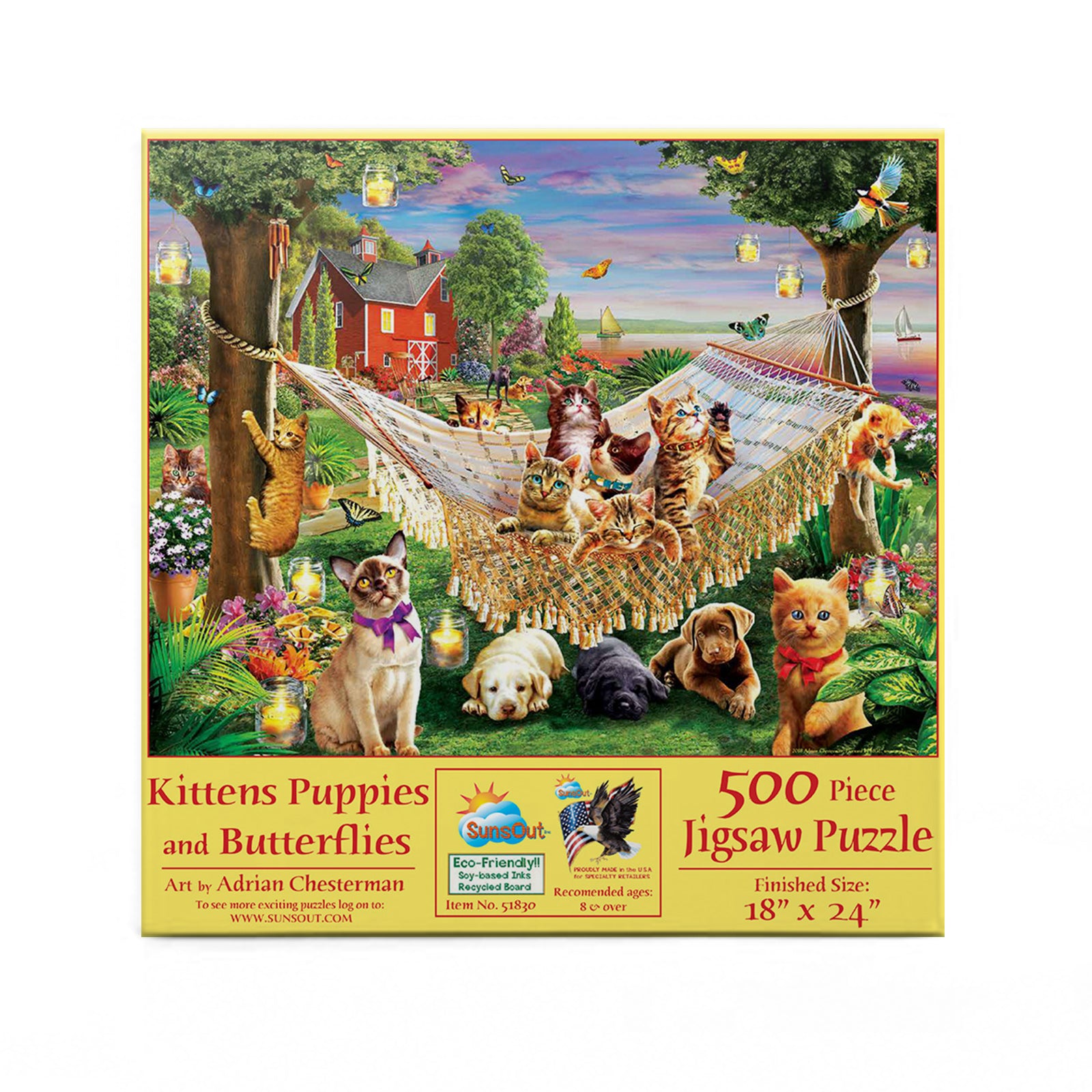 Dive into the whimsical world of the Kittens Puppies and Butterflies 500 Piece Jigsaw Puzzle by SunsOut, bringing the enchanting artwork of Adrian Chesterman to life. This puzzle, measuring a completed size of 18" x 24", combines the ideal mix of challenge and joy, offering adults a serene landscape filled with colorful, charming creatures. The pieces, made from high-quality recycled cardboard, fit together smoothly, reducing frustration and enhancing the experience, while epitomizing superior craftsmanship. SunsOut, a proud woman-owned USA business, is committed to sustainability with puzzles crafted from eco-friendly soy-based inks and recycled materials, maintaining high manufacturing standards. The richly detailed artwork by Adrian Chesterman offers a fully licensed, authentic scene brimming with engaging storytelling. Customer satisfaction is key for SunsOut, with all puzzles coming with a guarantee to swiftly resolve any issues with missing or damaged pieces. Investing in the Kittens Puppies and Butterflies 500 Piece Jigsaw Puzzle is more than just a leisure activity; it's an invitation to explore, unwind, and nurture your creativity while experiencing the satisfaction of completing a delightful masterpiece.