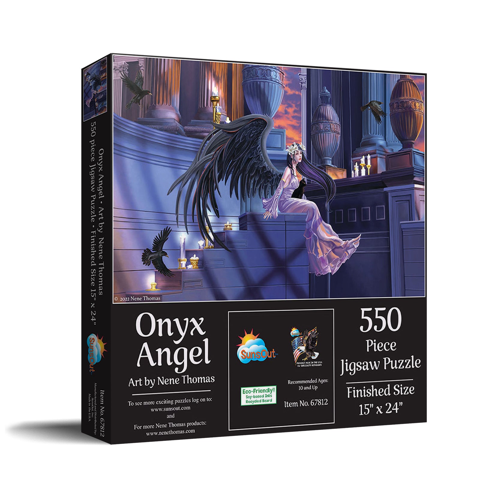 Dive into the enigmatic world of fantasy with the Onyx Angel 550 Piece Jigsaw Puzzle by SunsOut. Measuring at an enthralling 15" x 24" when complete, this celestial masterpiece, designed by renowned fantasy artist Nene Thomas, invites you on an imaginative journey where dreams take flight. Each piece of this puzzle, crafted from durable, recycled cardboard, fits seamlessly into the next, making assembly a satisfying experience. SunsOut is recognized for its commitment to eco-friendliness, using soy-based inks and recycled boards to create stunning, high-quality puzzles that offer years of enjoyment. The vibrant colors and meticulous cuts reveal an enchanting narrative, turning every puzzle piece into a tiny, individual work of art. If you ever encounter a missing or damaged piece, SunsOut guarantees swift resolution, underscoring the company's unwavering commitment to customer satisfaction. Proudly American and woman-owned, SunsOut offers an unforgettable, artistic puzzle experience that actively supports independence and creativity. Dive into the mystery and wonder of this captivating puzzle experience today.