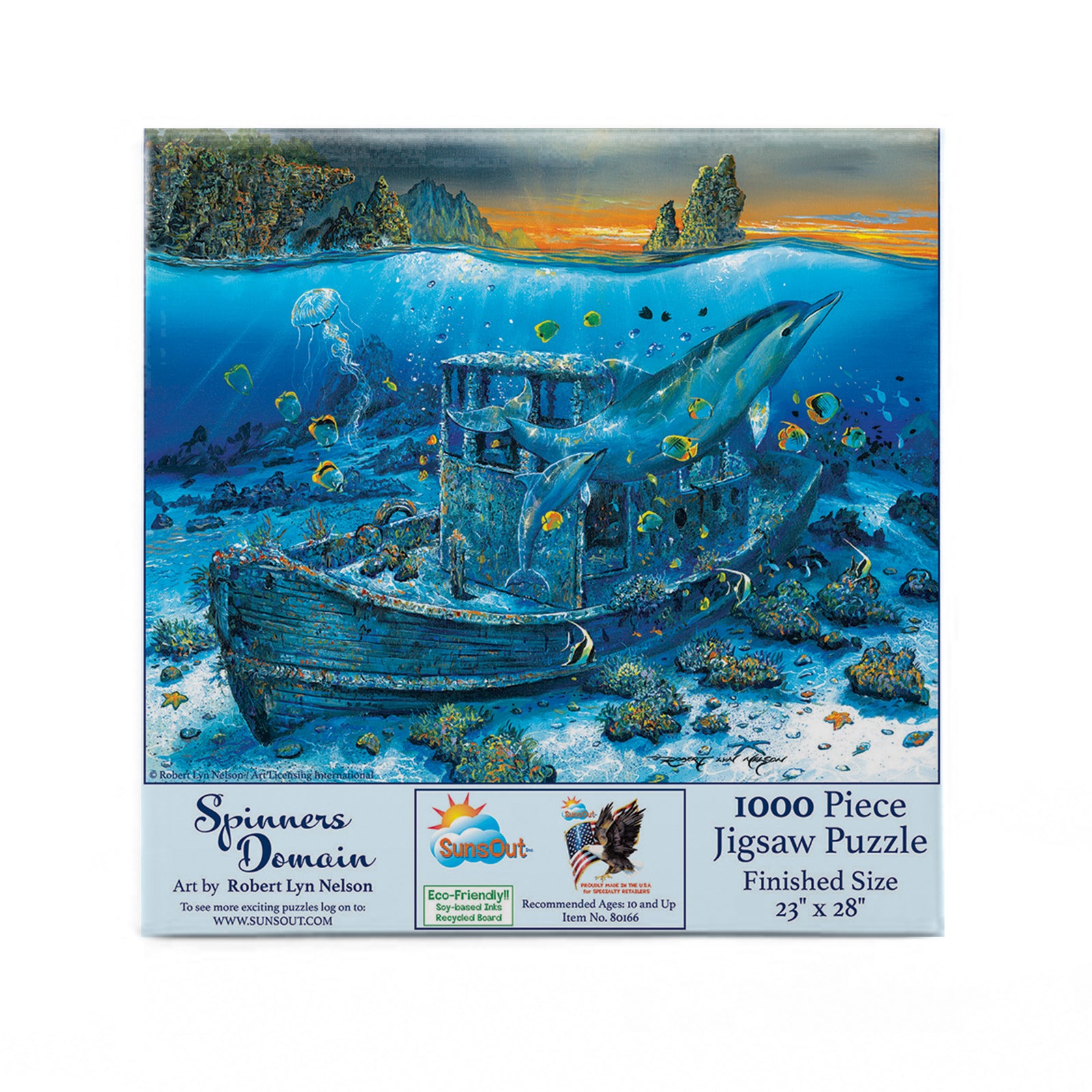 Dive into a world of creativity and craftsmanship with the captivating Spinners Domain 1000 Piece Jigsaw Puzzle for adults. Proudly made in the USA by SunsOut Puzzles, this jigsaw features the enthralling artwork of Robert Lyn Nelson, expertly reproduced on high-quality recycled cardboard. Each precisely tailored piece interlocks seamlessly for a satisfying and frustration-free assembly, forming a stunning, life-like depiction of sea life that is great for relaxation and mental exercise. With a completed size of 23" x 28", this puzzle doesn't just bring the mesmerizing beauty of the underwater world to your fingertips but it also serves as a breathtaking display piece you'll be proud to show off. SunsOut puzzles, as a woman-owned small business, demonstrates a passionate commitment to sustainability with its use of eco-friendly soy-based inks and top-quality recycled board material, without compromising on the vivid colors and fine details of the licensed artwork. Enjoy the satisfaction of creating a masterpiece where nature and imagination intersect, transforming each puzzle session into an enriching escape. American-made quality, a relentless dedication to customer satisfaction, and a true appreciation for art and nature are synthesized in the Spinners Domain puzzle, ensuring countless hours of entertainment and enchantment.