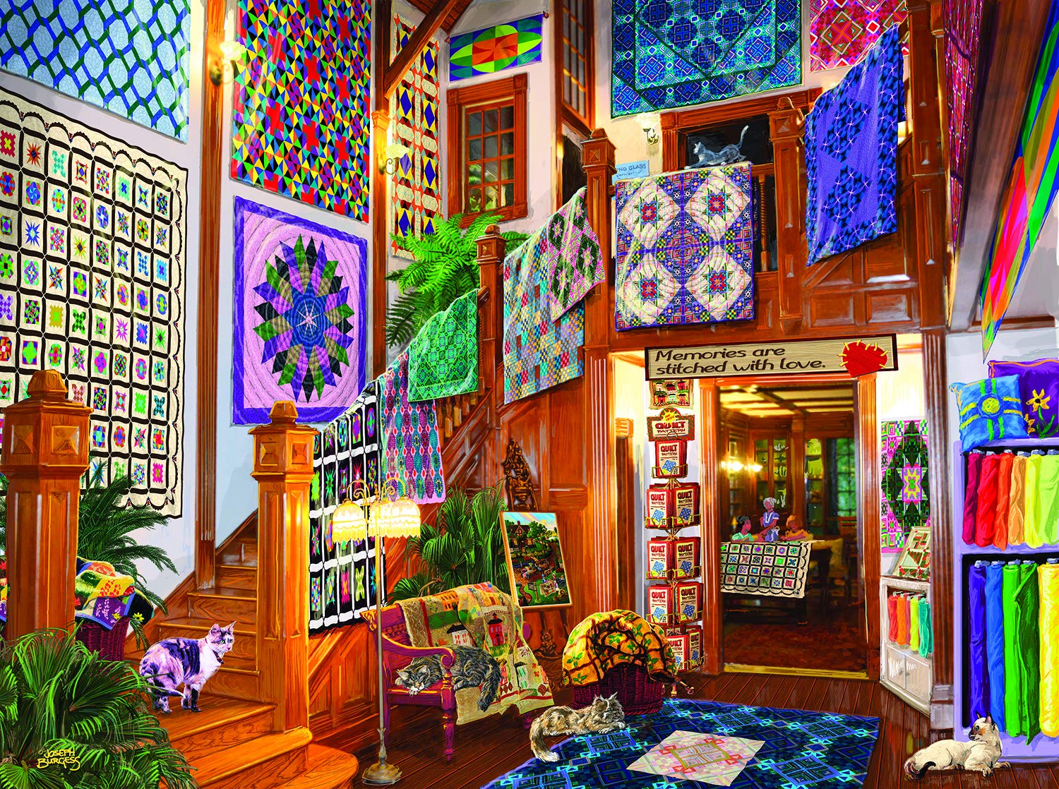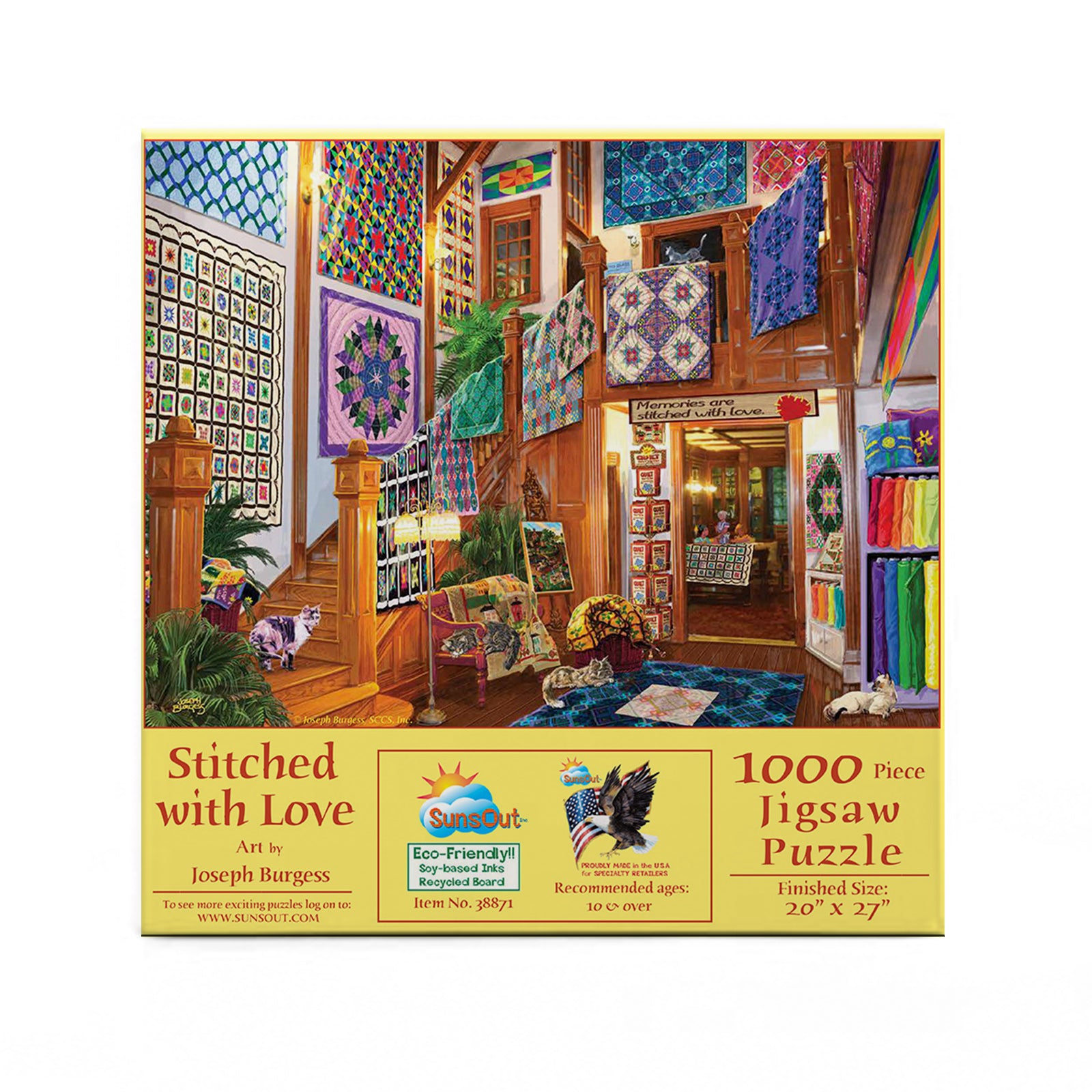 Immerse yourself in artistry with SunsOut's "Stitched with Love 1000 pc Jigsaw Puzzle", meticulously crafted by acclaimed artist Joseph Burgess. Perfect for adults, it transforms quilt art's intricate beauty into a captivating puzzle designed to stimulate the mind and captivate the eye. Distinguished by their robust, interlocking pieces, SunsOut puzzles promise a satisfying assembly process. Each piece is made from high-quality recycled cardboard, advocating eco-friendly manufacturing while preserving product quality. The vibrant colors enhanced by soy-based inks not only enhance the puzzle's visual aesthetic but also underline SunsOut's commitment to environmental responsibility. The puzzle reveals a breathtaking 20"x27" scene upon completion, bearing testimony to Burgess's masterful artistry. SunsOut, a woman-owned small business in the USA, emphasizes high-quality production standards and offers a worry-free guarantee. In case of any issues, Sunsout ensures prompt customer service, thereby underscoring their commitment to customer satisfaction. The "Stitched with Love" puzzle, whether as a gift or a self-challenge, embodies warmth and creativity. With its vibrant, full-color display box, it serves as a splendid invite to explore the enchantment within, attracting puzzle enthusiasts and art lovers alike. "Stitched with Love" seamlessly marries art, quality, and eco-friendliness, promising to transform your time into an engaging, artistic endeavor.