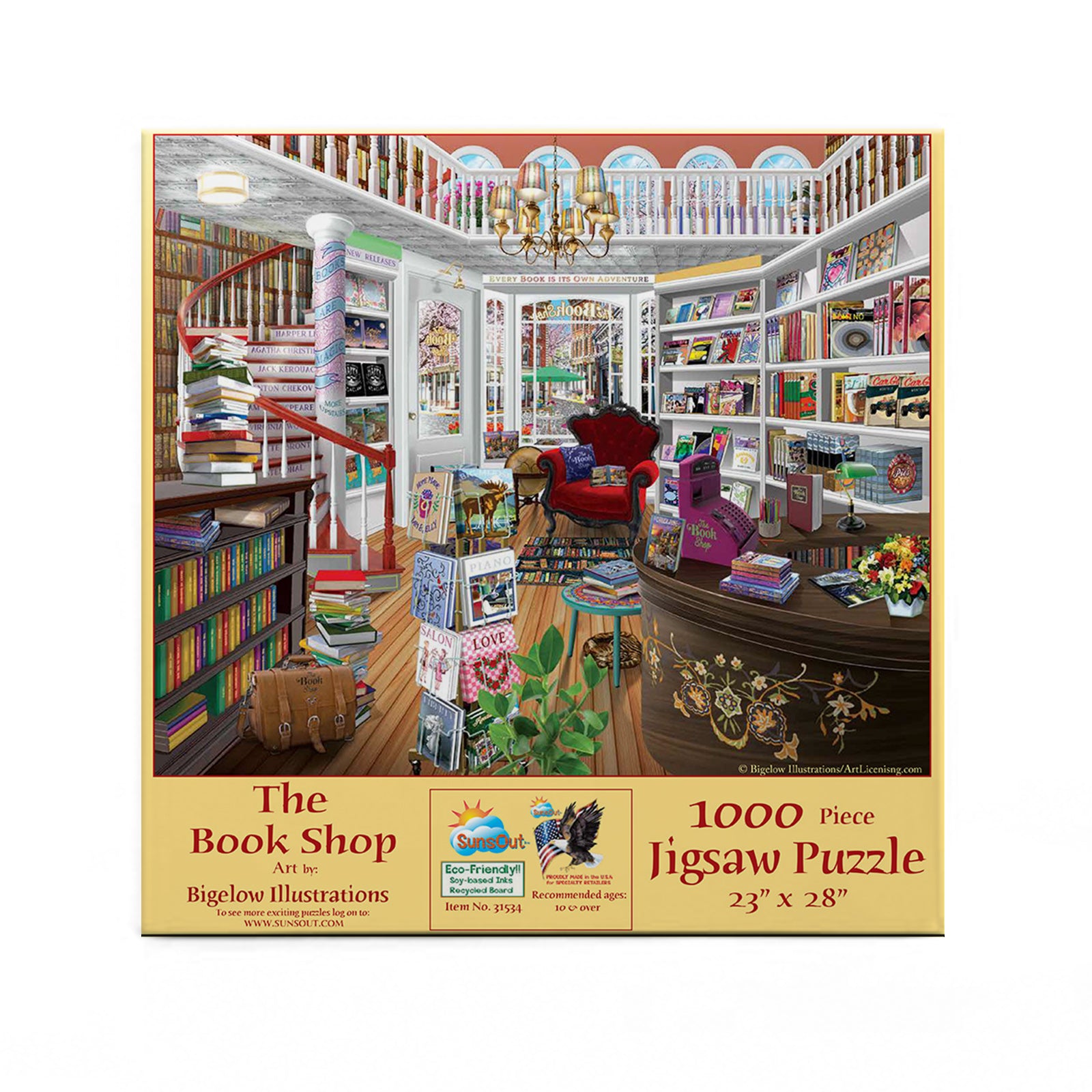 Dive into the idyllic charm of a small town bookstore with The Book Shop 1000 Piece Jigsaw Puzzle by SunsOut, a family-owned, woman-led business. An exquisite creation by Bigelow Illustrations, this puzzle brings the cozy allure of stacks of well-loved books to life in your living room, giving you a delightful assembly experience with great ambiance and stunning artwork. Crafted from recycled cardboard and soy-based inks in the USA, SunsOut puzzles are known for their eco-friendly materials and premium quality, featuring robust construction and secure interlocking pieces that promise seamless assembly. Beyond providing an enjoyable puzzle experience, SunsOut offers unrivaled customer satisfaction, with a worry-free guarantee to address any concerns over missing or damaged pieces, reflecting their dedication to exceptional service and customer peace of mind. The completed 23" x 28" masterpiece showcases intricate designs and bright tones, embodying the beguiling allure of Americana in an immersive homage to the love of books. Choosing SunsOut not only means getting a captivating puzzle experience, but also supporting a business that values quality, community, creativity, and sustainable practices. Each puzzle stands as a testament to the passion that goes into crafting unique and memorable experiences for puzzle enthusiasts.