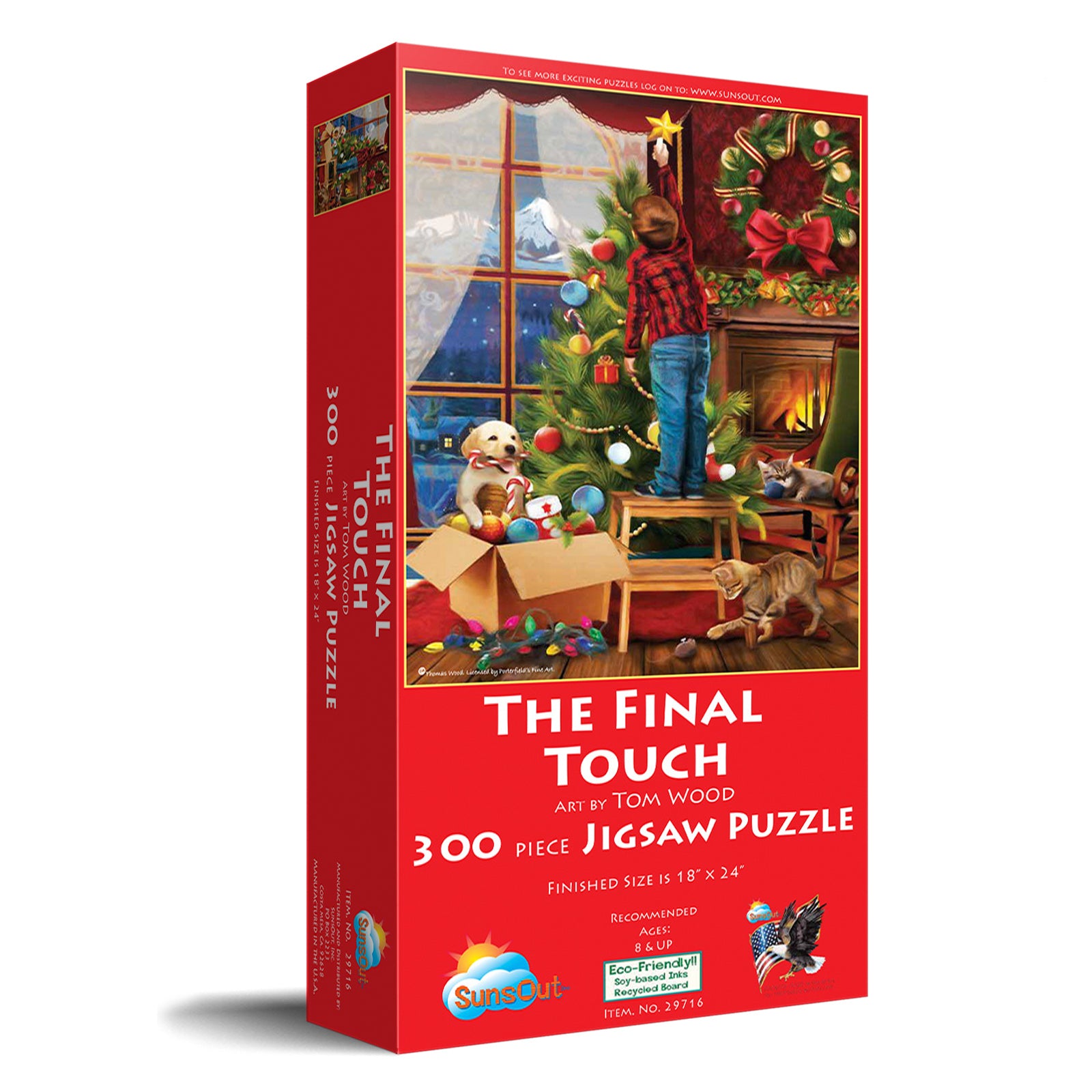 Embark on a magical journey with the durable and beautiful "The Final Touch" 300 piece jigsaw puzzle by woman-owned American small business, SunsOut Puzzles. Crafted with high-quality, recycled cardboard and printed with soy-based inks, SunsOut Puzzles are renowned for their superior construction, commitment to eco-friendly practices, and vivid, long-lasting colors. The enchanting artwork for this puzzle is provided by Tom Wood, transporting you to a nostalgic Christmas season and transforming any space into a winter wonderland. Perfect for adults, its assembly provides a peaceful retreat from the holiday hustle and results in an artwork that will fill your space with joy all winter long. When complete, it measures 18" x 24", the perfect size for display. "The Final Touch" is not just a puzzle, it's a chance to bring together family and friends, bridging generations for cherished interactions and lasting memories. So come experience the warmth and togetherness of the holiday season, while supporting artistic talent, ethical production, and local communities.