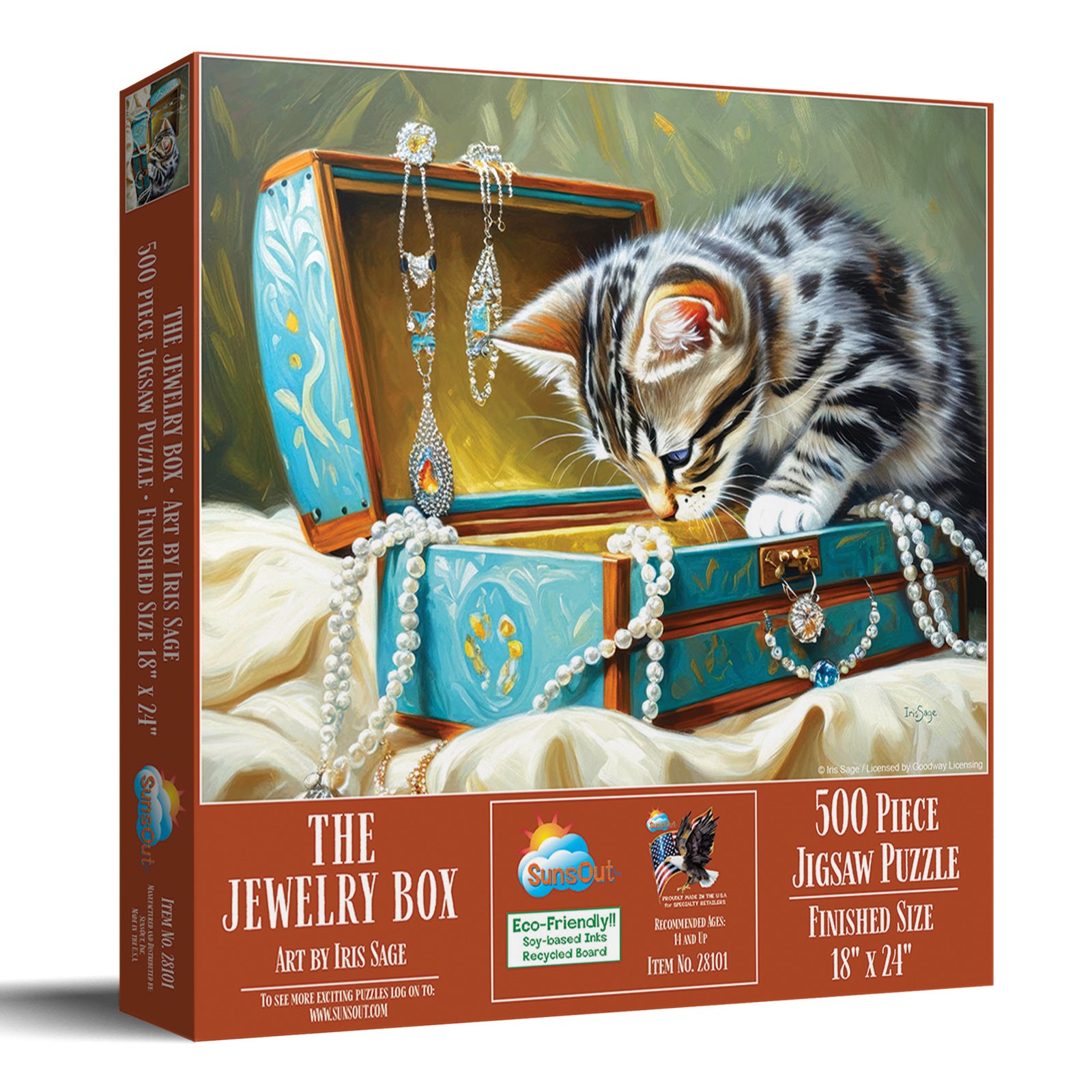 The Jewelry Box 500 Piece Jigsaw Puzzle - 500 pc Jigsaw Puzzle - Completed Size: 18" x 24" - Puzzle Artist: Iris Sage - Interlocking Pieces and Durable Construction: SunsOut jigsaw puzzles feature interlocking pieces that fit securely, making assembly easier and reducing frustration. Made with high-quality recycled cardboard, they are durable and to easy to work with - Warranty: SunsOut puzzles being made in the USA ensures high manufacturing standards include a worry-free guarantee ensuring any issues with missing or damaged pieces are resolved, reflecting SunsOut's commitment to quality and customer service. - Eco-Friendly Materials: SunsOut puzzles are crafted with eco-friendly materials