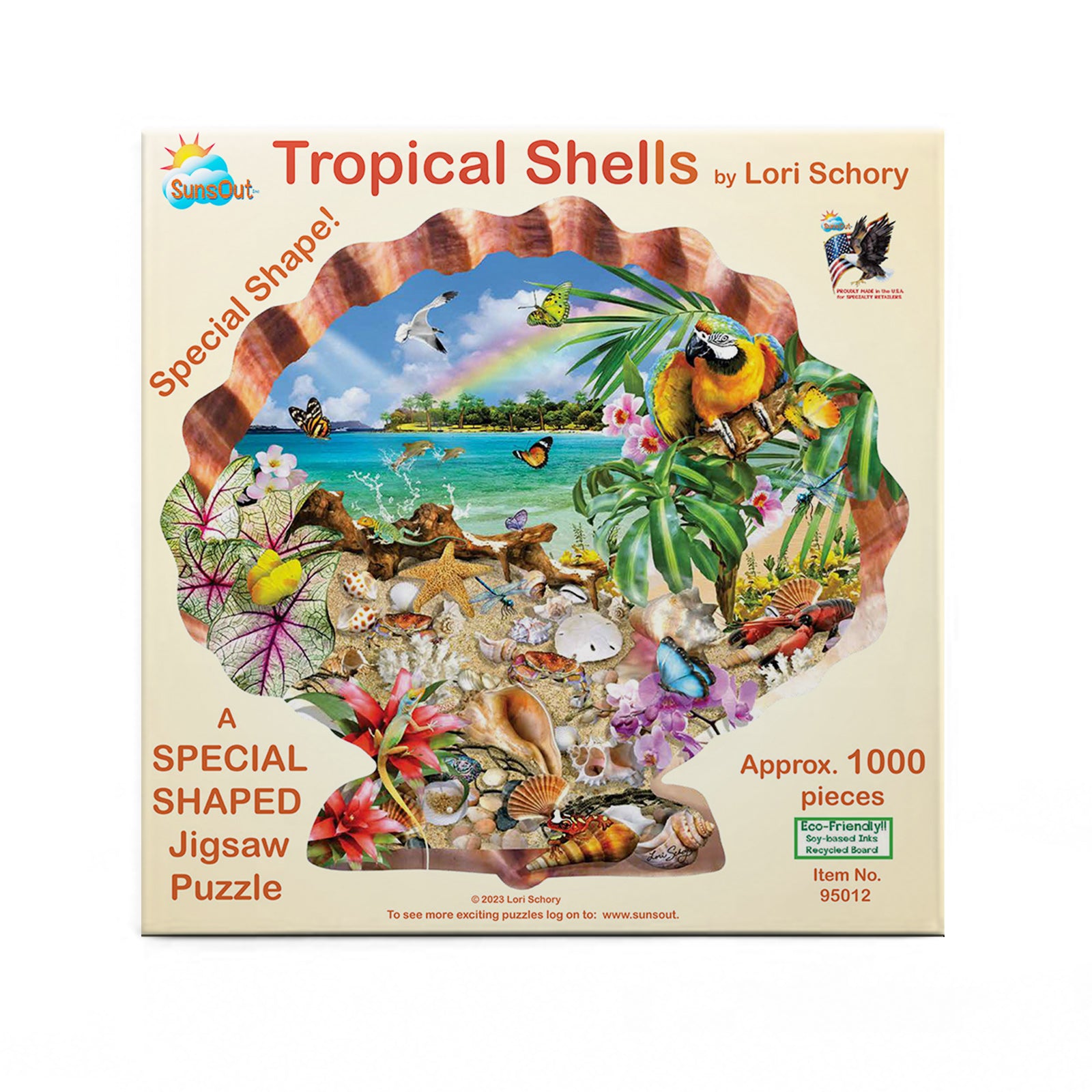 Immerse yourself in a vibrant tropical world with an 800 piece Tropical Shells Special Shaped Jigsaw Puzzle by SunsOut, featuring exotic shells, flora, fauna, and breathtaking artwork by Lori Schory. Each piece brings you closer to completing the stunning 27.25" x 27.125" display that promises to be a conversation starter. Crafted from high-quality recycled cardboard, SunsOut guarantees a frustration-free and satisfying puzzle experience with durable, meticulous, and interlocking pieces. The eco-conscious puzzles, made with soy-based inks from recycled materials, allow you to enjoy your puzzling passion in an environmentally friendly way. SunsOut, proudly made in the USA, is dedicated to keeping its crafts eco-friendly without compromising on the vibrant, lifelike colors of the puzzles. Their commitment to quality extends to excellent customer care, offering a worry-free guarantee to resolve any issues swiftly, validating the brand's trust. This exquisite puzzle, featuring meticulously licensed artwork and a representation of Americana artistry, offers more than just entertainment- it's an enriching journey into art and nature for enthusiasts and admirers of beach scenes and unique shaped puzzles.