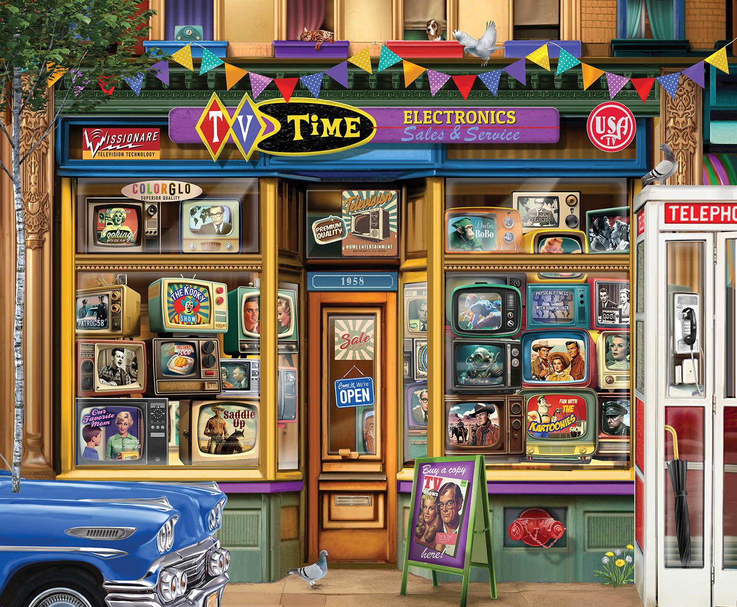 Step into a journey of fond reminiscence with "TV Time - 1000 pc Jigsaw Puzzle", a product of SunsOut Puzzles, adorned with artwork by the revered Bigelow Illustrations, ignites a vintage spirit brimming with pop culture recollections. Each piece of this 23" x 28" puzzle ensures a captivating and rewarding task for puzzle lovers. SunsOut Puzzles, an American company, is proud of their exceptional product made from high-quality, robust recycled cardboard, handcrafted to perfection ensuring secure fitting for a flawless assembly and longevity. The adoption of environmental friendly practices such as using soy-based inks and top-class recycled materials showcases not merely the joy of the puzzling experience, but also a mindful attention to Mother Earth. Each piece narrates a tale through its dynamic and vivid imagery, all licensed by esteemed artists, fostering a bond that extends beyond mere cardboard pieces. This nostalgia-inducing puzzle serves as a beautiful gift to yourself or any adult puzzle enthusiasts in your life, offering moments of tranquility and creative indulgence, while witnessing cherished memories coming alive piece by piece until the final work of art manifests as a reflection of your exceptional puzzling skill and fervor.