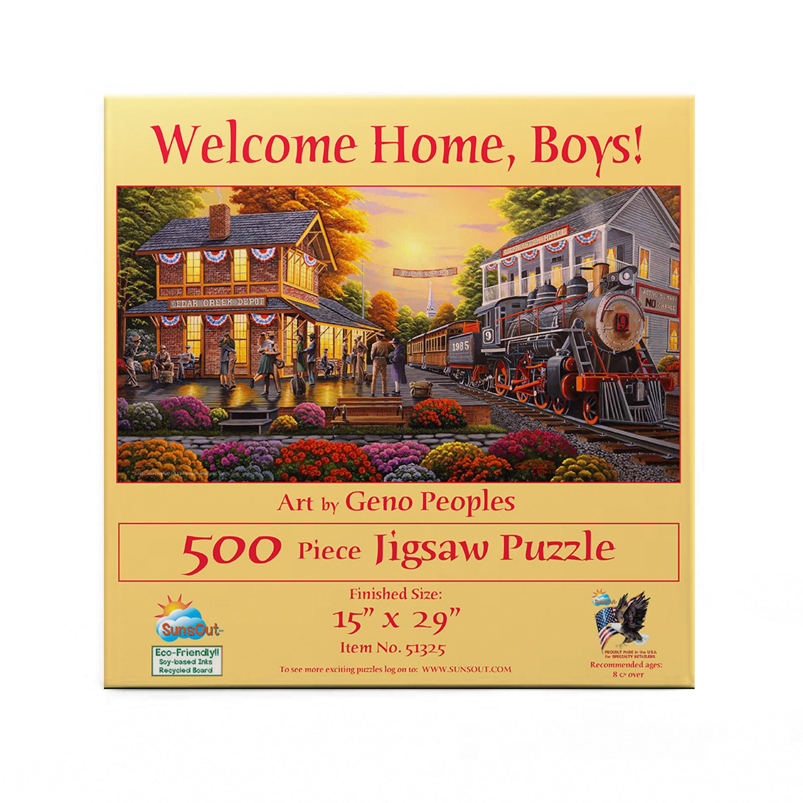 Welcome to the heartwarming world of American heritage with the "Welcome Home, Boys" 500 piece jigsaw puzzle for adults by SunsOut Puzzles. Designed by renowned artist Geno Peoples, this puzzle reflects a vibrant scene of Americana, complete with bustling trains and charming townsfolk. Not just a puzzle, but a beautiful piece of decor measuring 15" x 29" once completed, this puzzle promises both a challenge and an artistic experience. SunsOut puzzles are meticulously created with durable, interlocking pieces and are crafted from high-quality recycled cardboard, ensuring a seamless and enjoyable assembly process. The puzzles are made in the USA, reflecting a commitment to high standards and a worry-free guarantee inclusive of addressing issues with missing or damaged pieces. Not only are these puzzles thoughtfully designed, but they're also eco-friendly, crafted with soy-based inks and recycled materials, making each puzzle a vibrant tribute to sustainable practices. As a proud, women-owned American small business, SunsOut emphasizes quality, sustainability, and US craftsmanship. Choosing their puzzles means supporting a gripping pastime and a company grounded in American artistry. The "Welcome Home, Boys" puzzle presents a timeless gift that plunges you into an emotional journey into a bygone era, blending the charm, history, and allure of American life into a thought-provoking and unique puzzle experience. Explore the intriguing narratives waiting to be pieced together in this delightful puzzle journey.